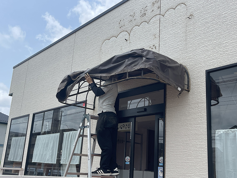 【特殊テント】店舗用デザインテント張替、オーニング追加取付工事